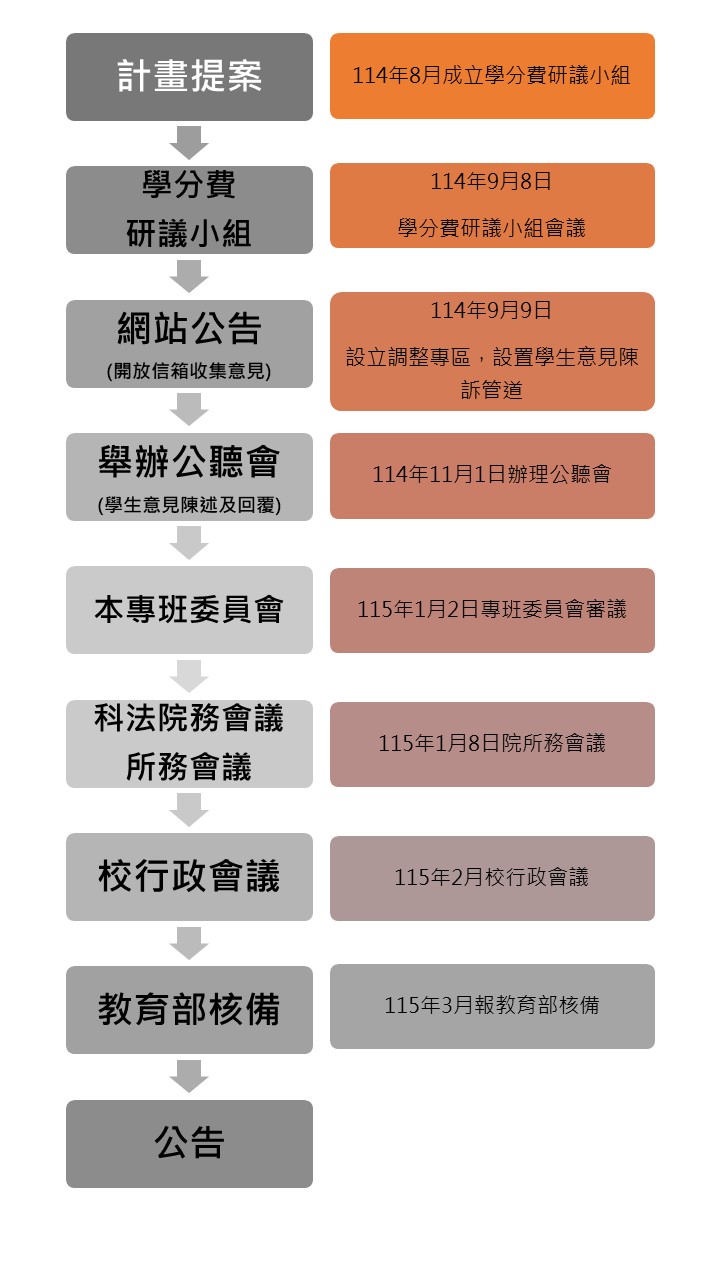 - 本次學分費調整預計自115學年度入學新生適用,調整流程及估計時程如下圖。